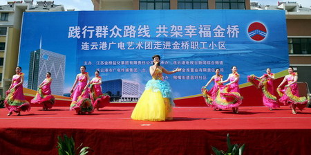 為了貫徹黨的群眾路線教育實(shí)踐活動(dòng)精神,豐富基層職工的精神文化生活。6月28日上午,由連云港廣電傳媒集團(tuán)和集團(tuán)公司共同主辦的“踐行群眾路線,共架幸福金橋”連云港廣電藝術(shù)團(tuán)走進(jìn)鹽場(chǎng)職工小區(qū)文藝演出在猴嘴昌圩湖社區(qū)拉開(kāi)帷幕。廣電傳媒集團(tuán)領(lǐng)導(dǎo)戴詠寒、馬富勝、萬(wàn)自力,集團(tuán)公司領(lǐng)導(dǎo)顧永庚、鄭宜虎、戴鴻鳴與數(shù)百名鹽場(chǎng)職工群眾歡聚昌圩,共同欣賞來(lái)自連云港廣電新聞綜合頻道的主持人和編輯記者與金橋職工自編自演的精彩節(jié)目。