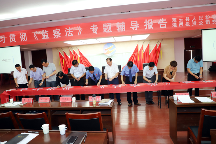 此次集中培訓(xùn)只是我公司深入學(xué)習(xí)貫徹監(jiān)察法的舉措之一,按照公司紀(jì)委統(tǒng)一部署,把監(jiān)察法納入公司干部必修課程及各類黨員培訓(xùn)內(nèi)容,通過座談會、報告會等多種形式,深化學(xué)習(xí)培訓(xùn)效果,把學(xué)習(xí)培訓(xùn)延伸到基層一線。會后全體與會人員集體在“學(xué)深學(xué)透《監(jiān)察法》,做遵紀(jì)守法國企人”橫幅上簽字承諾。(張明建)