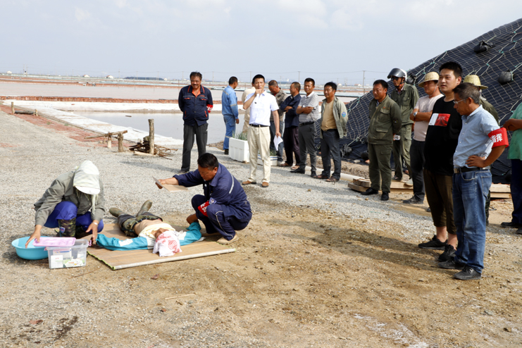 當天下午正直高溫天氣,室外環(huán)境悶熱?,F(xiàn)場,鹽工孫良成在烈日下工作幾個小時后早已汗流浹背,堅持工作一段時間后,感到頭暈目眩,支持不住倒在了鹽池邊上?,F(xiàn)場安全員張軍連第一時間趕到現(xiàn)場,根據(jù)經驗,初步判斷倒地者出現(xiàn)了中暑癥狀。立即組織員工董志波和曹軍華將孫良成抬至陰涼通風處,側臥后仰頭部,保持其呼吸暢通。并解開他身上的衣扣,一邊為他扇風送涼。大伙一邊用溫濕毛巾不斷為他擦拭身體降溫,一邊喂他服下藿香正氣水,并用清涼油、風油精等擦拭額頭位置。在現(xiàn)場急救迅速開展的同時,班長林樹軍立即向埒南分公司安全負責人江躍匯報,江躍到達現(xiàn)場了解情況并通知公司經理楊守斌,同時通知120急救中心,幾分鐘后,120急救人員趕到現(xiàn)場,并對中暑人員進行施救,經過緊張有序的急救,患者逐漸蘇醒并初步恢復神智,抬上救護車送去醫(yī)院,至此演練結束。