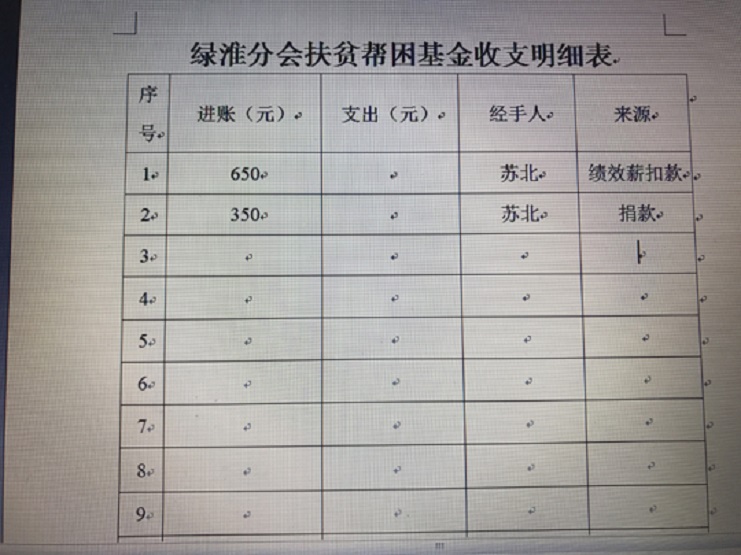 7月27日,綠淮公司出納將1000元現(xiàn)金匯入專(zhuān)有賬戶(hù),標(biāo)志著分會(huì)成功引入第一筆扶貧基金。