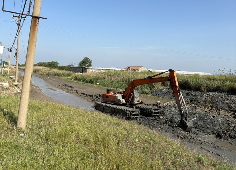 三洋分場高效養(yǎng)殖基地,挖掘機(jī)正揮舞手臂,進(jìn)行進(jìn)排水渠疏浚作業(yè),為防汛做好前期準(zhǔn)備工作,保障汛期安全穩(wěn)定。(青宣 田盛楠 史小佟)